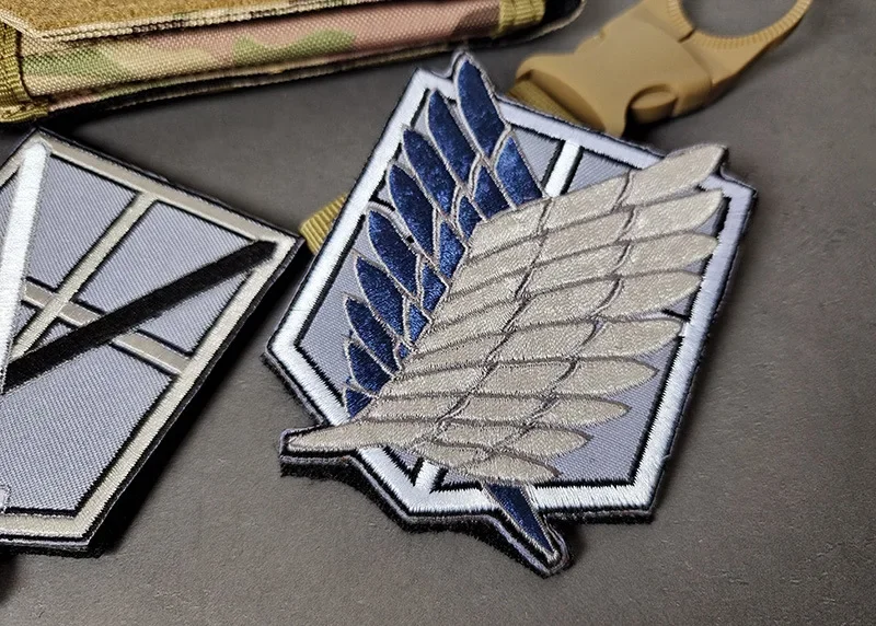 Attack on Titan Wings of Liberty embroidered and PVC rubber patch for backpacks, jackets, cosplay, and tactical gear. Ideal anime badge for fans and collectors.