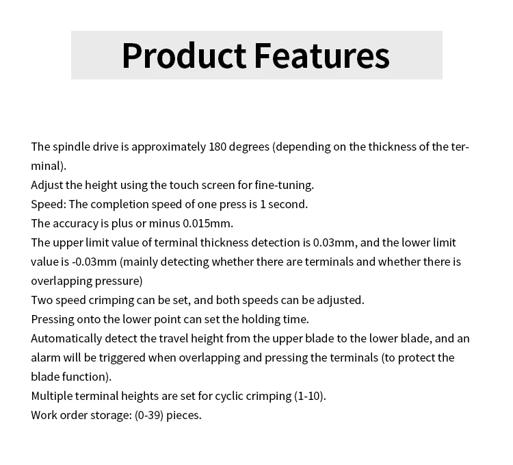 • Servo Motor Drive: Provides precise control over the crimping process, enhancing accuracy and repeatability.