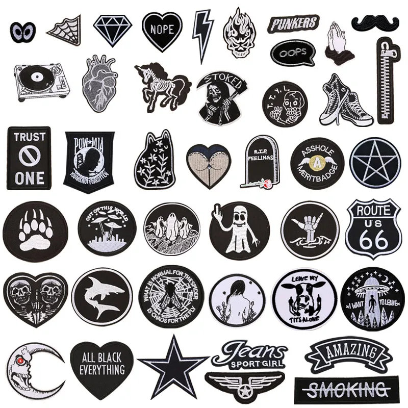 Shop Now: 46 Styles of Black and White Iron-On Patches for Clothes – Letter Appliques, Skulls, Stripes, Embroidery Stickers, Round Badges