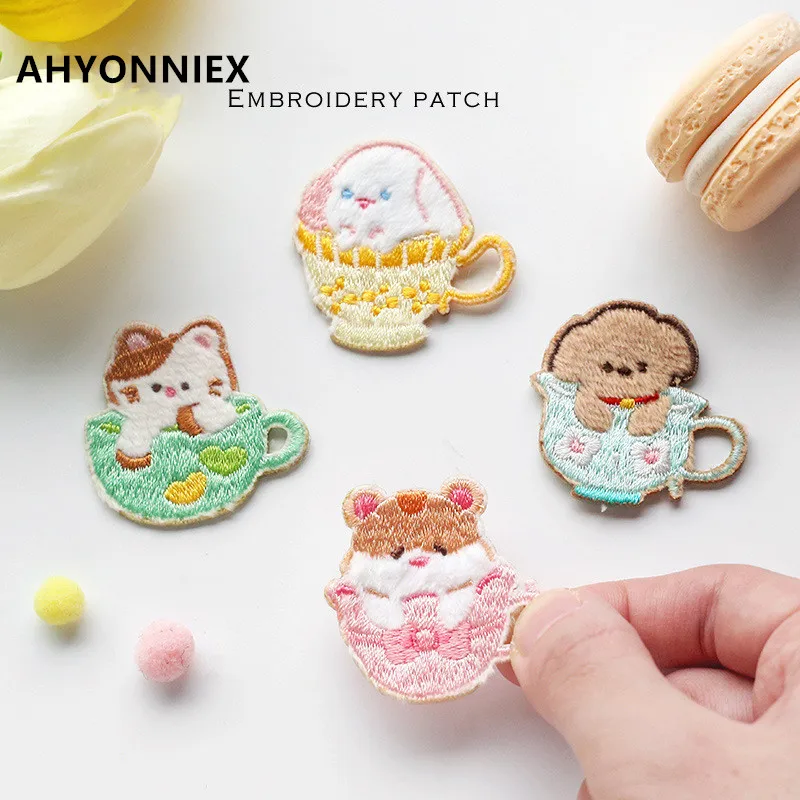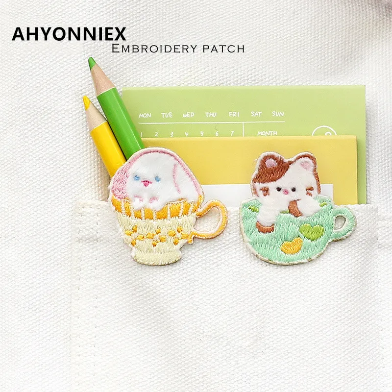 AHYONNIEX Cute Cup Cat Embroidery Patches for Bag Jeans Dog Teddy Rabbit Hamster Iron On Patches for Clothes Small DIY Patches