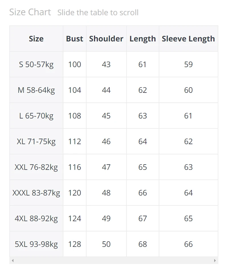 4XL 88-92kg5XL 93-98kgL 65-70kgM 58-64kgS 50-57kgXL 71-75kgXXL 76-82kgXXXL 83-87kg