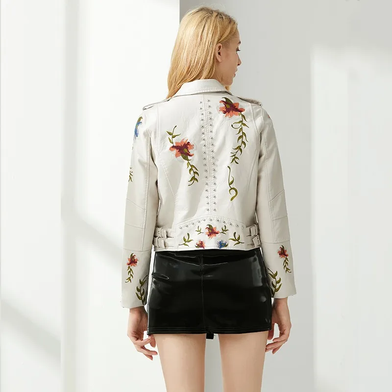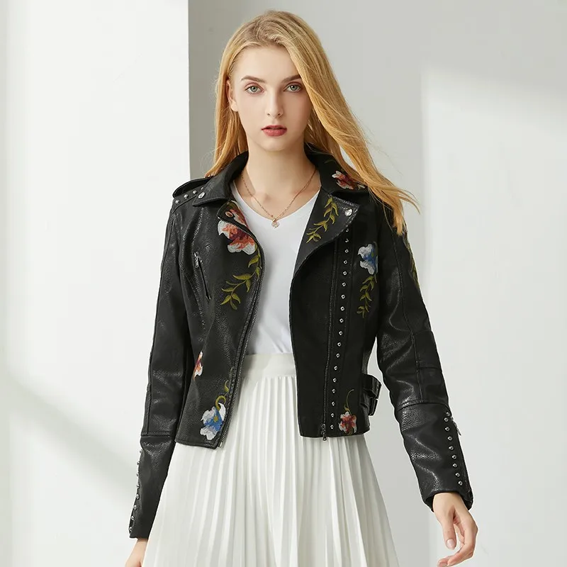 Buy New Autumn Women Floral Embroidery Pu Faux Leather Streetwear Punk Style Biker leather Jacket Online