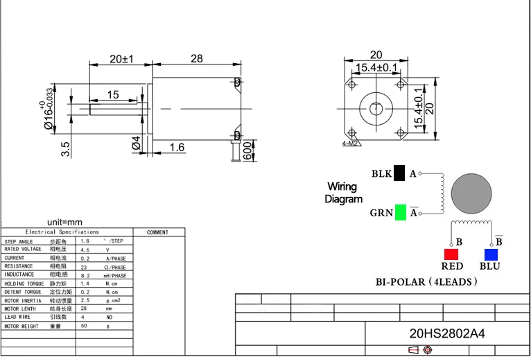 The dimension and wiring of Single shaft Nema8 stepper motor 20HS2802A4 :(unit:mm)